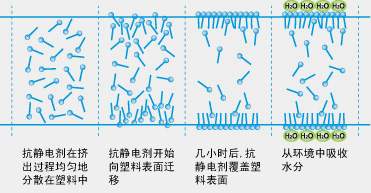 在擠出過(guò)程中加入到聚合物中,使其均勻分布在聚合物內(nèi),待加工成型后,抗靜電劑分子借助聚合物分子的鏈段運(yùn)動(dòng)而向表面遷移,吸收空氣中的水分,形成均勻?qū)щ妼?,?lái)消除靜電。當(dāng)塑料表面的抗靜電層缺失或損壞時(shí),內(nèi)部的抗靜電劑分子可以繼續(xù)向外遷移補(bǔ)充,所以具有較持續(xù)的抗靜電效果。